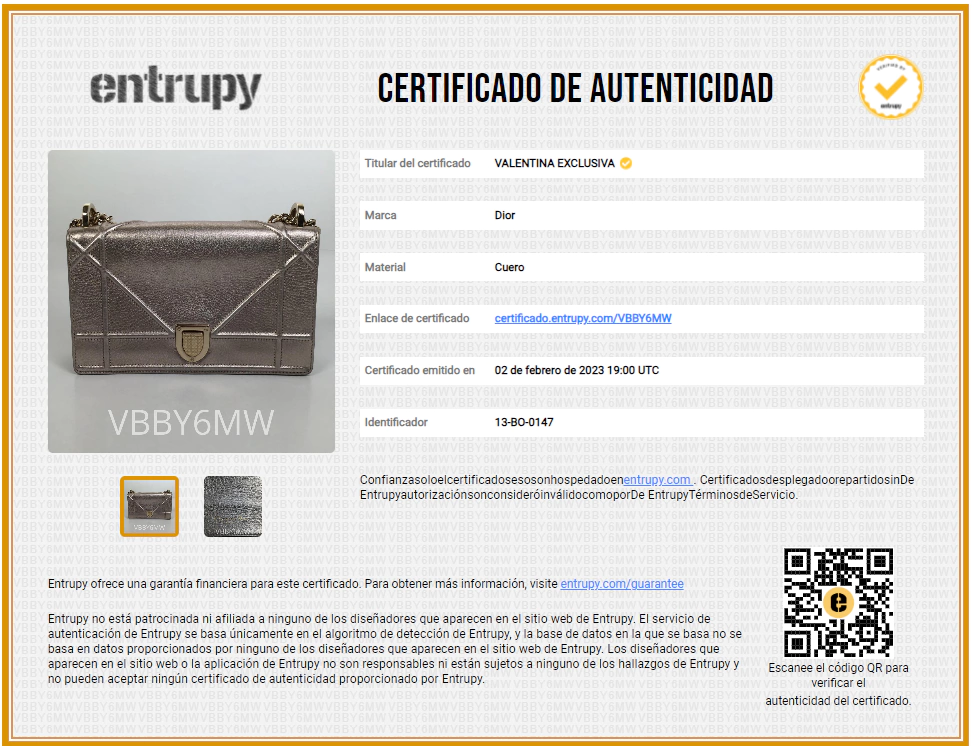 ¿Cómo recibo el certificado Entrupy? Si aplica, recibirás el certificado impreso. También puedes descargarlo directamente desde la página oficial de Entrupy utilizando tu número de certificado único, que se indica en "Detalles del Producto".