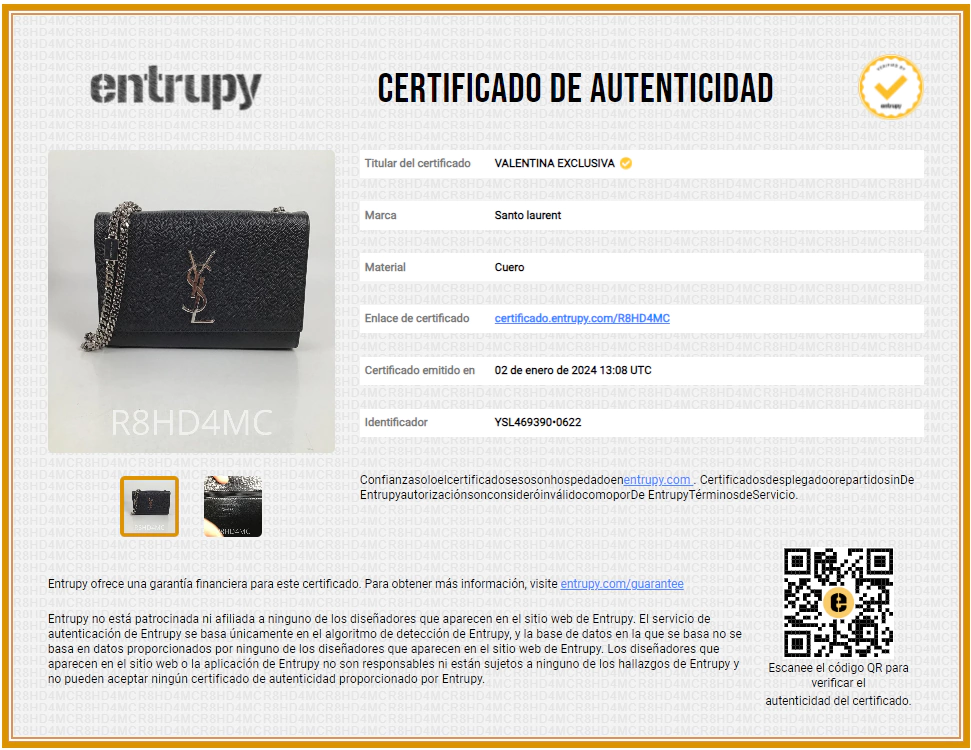 ¿Cómo recibo el certificado Entrupy? Si aplica, recibirás el certificado impreso. También puedes descargarlo directamente desde la página oficial de Entrupy utilizando tu número de certificado único, que se indica en "Detalles del Producto".